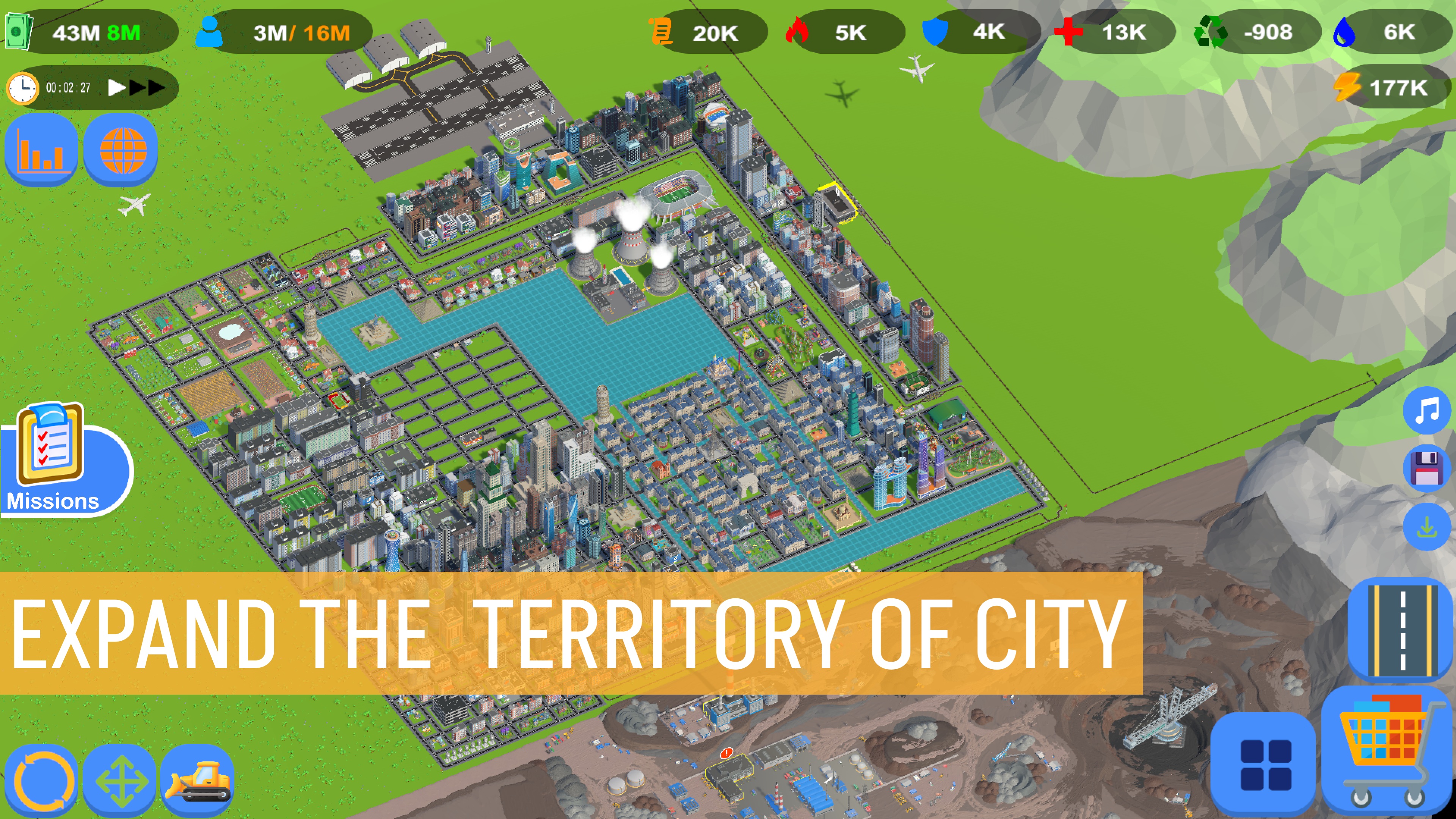 - Progression: Content is unlocked upon reaching population. Before constructing buildings it is necessary to build roads and resources(energy, water). Otherwise, buildings won't be built.
